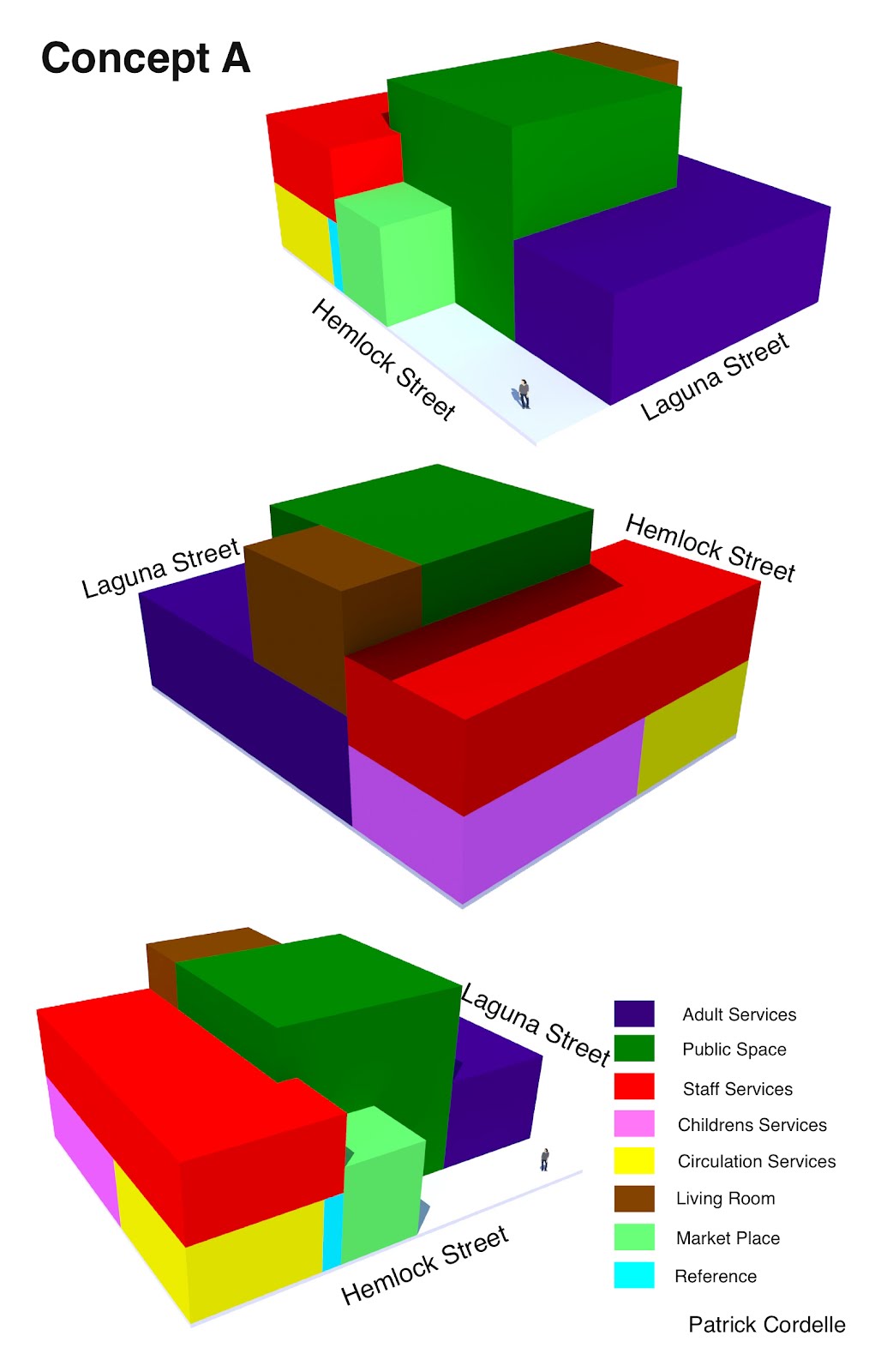 For Concept A, I wanted to create a design that has a public space at the core, a common feature in Japanese architecture. I did not place anything on top of this space so that it could be naturally lit with skylights. Around this public space I organized the other needed program space, keeping public areas and staff areas grouped together. The only public space above ground level is the living room, which has a corresponding deck space on the roof of the adult services. This deck would serve as an outdoor reading area for the library, integrating exterior space with the library.
